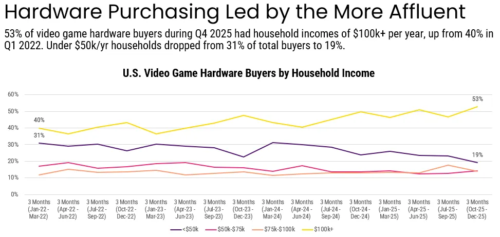 An analysis of hardware purchase demographics also shows that a majority (53%) of PlayStation owners earn more than $100k annually; the share of buyers earning less than $50k has likewise dipped to its lowest point (19%) as of Q4 2025.