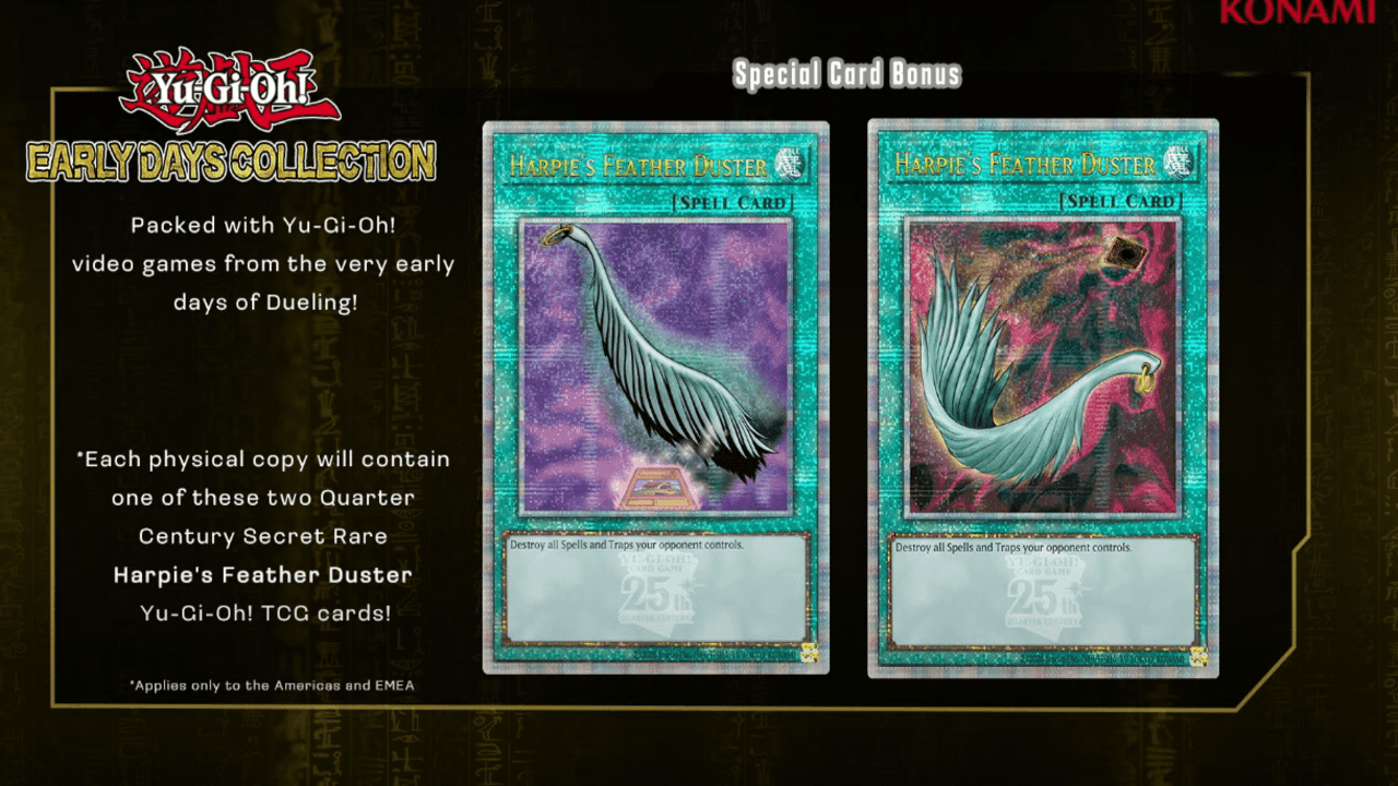 Additionally, as is tradition with classic Yu-Gi-Oh! video game releases, the collection will come with collectable and playable promotional cards. In this case, each copy of Yu-Gi-Oh! Early Days Collection will include one of two variations of the iconic Harpie’s Feather Duster spell card. This card will come in the new quarter century secret rare foiling and has a chance to have either the original artwork or the new style artwork.