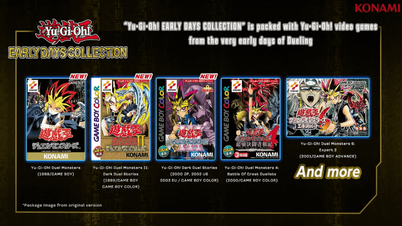 Revealed during the 2024 World Championship livestream and later posted on social media, Konami revealed that Yu-Gi-Oh! Duel Monsters (1998, Game Boy), Yu-Gi-Oh! Duel Monsters II: Dark Duel Stories (1999, Game Boy Color), and Yu-Gi-Oh! Dark Duel Stories (2000 JP, 2002 US, 2003 EU, Game Boy Color) will be joining Yu-Gi-Oh! Duel Monsters 4: Battle of Great Duelists (2000, Game Boy Color), Yu-Gi-Oh! Duel Monsters 6: Expert 2 (2001, Game Boy Advance) as a part of the classic remaster collection. Many of the titles announced for the collection never saw a release outside of Japan, marking the first time players will be able to experience these classic games localized outside Japan.