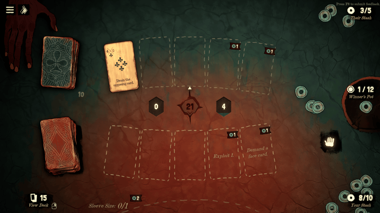 On the table as well are card slots, some of which give effects such as increasing values or allowing you to force opponents to add extra coins that dictate their life pool into the round. These can be powerful tools, but they usually cost you an extra coin to use. If you win, you get the amount of coins you played into the hand back, but if you lose, that point is removed and placed in the winner’s bowl of coins.