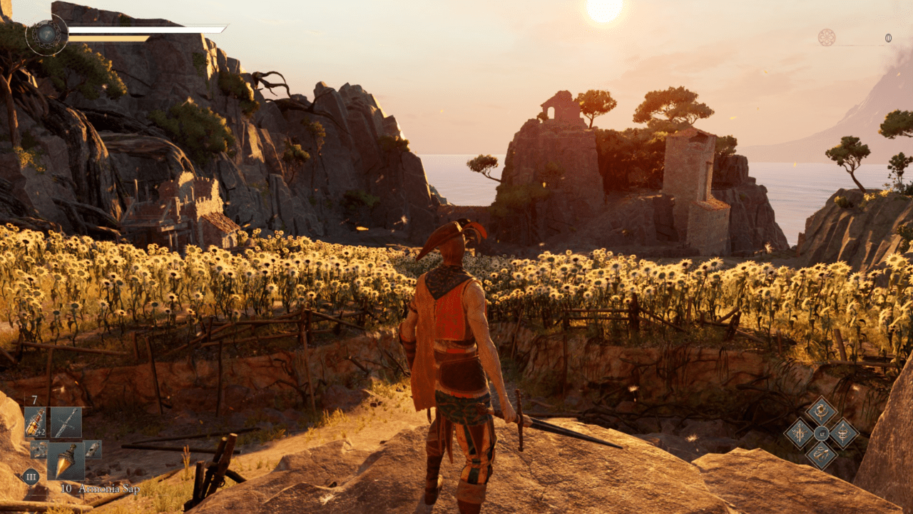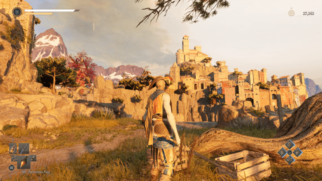 If that description sounds colorful then it reflects in the game’s world design and aesthetic. In this short demo I was able to explore three areas each ending in a boss fight to capstone the level. From a beautiful sun-baked beachfront to a thriving Italian city and ending with an unnerving graveyard overgrown with giant tree roots, each area in Enotria was strikingly gorgeous and diverse. These locations certainly stand-out from the standard dark fantasy souls-likes tend to favor.