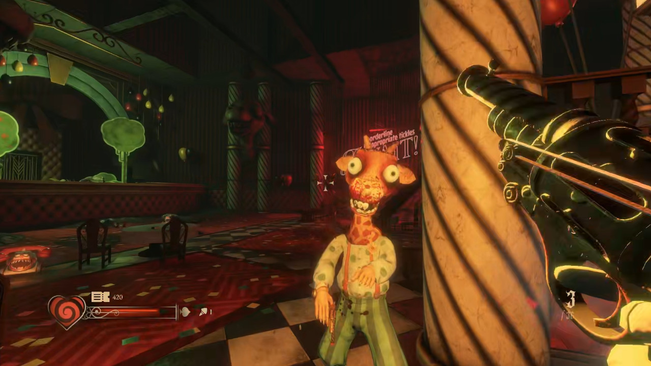 The gameplay loop sees you blast through warped mascot enemies with upgradable weaponry all thanks to a chap who looks like their face belongs plastered to the machine, with my mind always playing “Welcome to the circus of value” as I look at the upgrades, all for the price of tickets, which you can find plenty of sprawled across the hotel floor or looted off the corpses of those you slain.