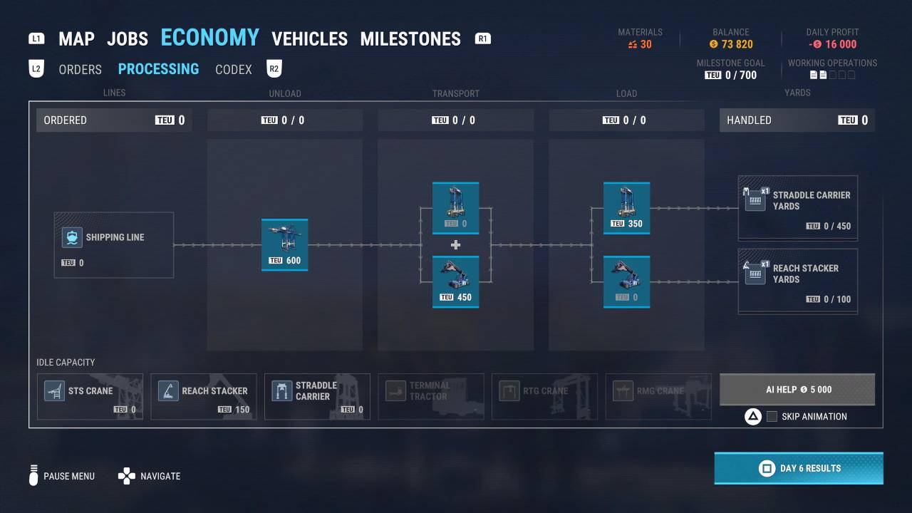 One of the new mechanics in the game is Processing where players need to match the amount of TEU (twenty-foot equivalent unit). The feature becomes a puzzle to get the vehicles that allot these units to fill up to the daily amount of TEU handled. And honestly, the system feels like a mess to deal with. Even after re-reading the tips on how to do the Processing, it just felt confusing. And with profits continually decreasing, it can leave you feeling lost. While you can use AI to help you fill what you have available, it costs in-game currency, leaving you at more of a loss if you need assistance.