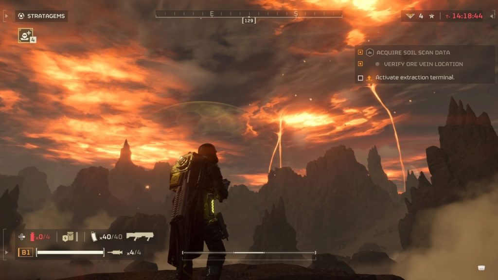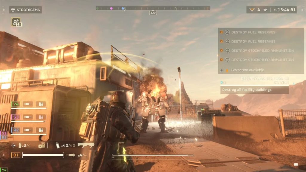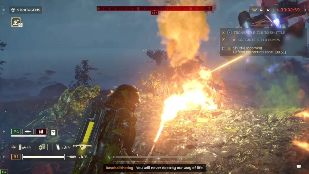 The gameplay of Helldivers 2 is just as simple. You play as a Helldiver with limited ammo, health, and respawns. You can play with up to three other players, with your lives increasing as more people join, topping out at 20. Your main objectives are shown in the mission briefings and on the map, which you can see anytime by pressing the touchpad. All players can access stratagems, which is Helldiver’s signature mechanic, allowing you to call down things like a machine gun or a 500K bomb dropped by a jet. All stratagems have a cooldown, with some of the most powerful having limited uses. Keep in mind friendly fire is on at all times for all stratagems and weapons, so coordination is important if you don’t want to kill your squadmates. Usually, this would lead to frustration as your oblivious squadmate drops napalm on your head, however, because respawning is quick and you can collect all your gear from your body, the consequences are much lighter than in a game like Counter-Strike.