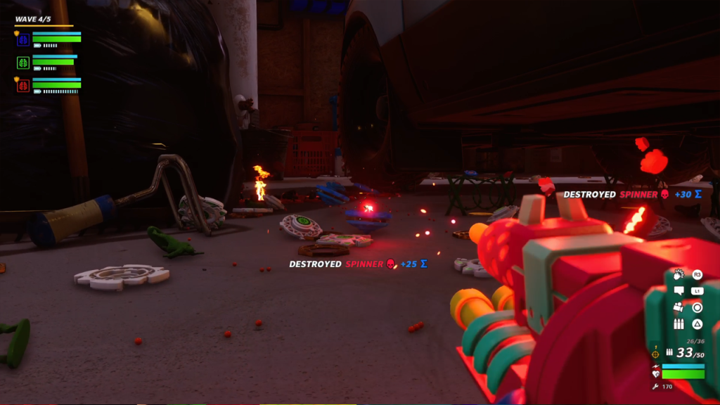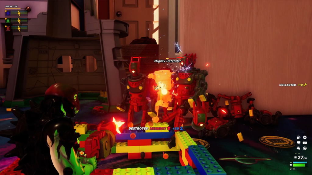 Speaking of exploring, Hypercharge also includes parkour mechanics. The maps and levels take place in areas that we see in our daily lives, however, considering you’re a tiny toy, the maps are huge instead. This is where the parkour mechanic comes into play. Scattered all over the map are a variety of things to find and collect. These can range from new weapon attachments to add to your gun, medals you can use to create your defences in the campaign mode, or secret collectibles that will snag you some new gear. You’ll have to use your skills to time the jumps right to get to your destination or else you’ll fall down and have to start over again. The parkour at first can be quite stiff, as well as the game’s basic movement speed, but that quickly subsides after a couple of hours and can be very rewarding getting to those hard to reach areas.
