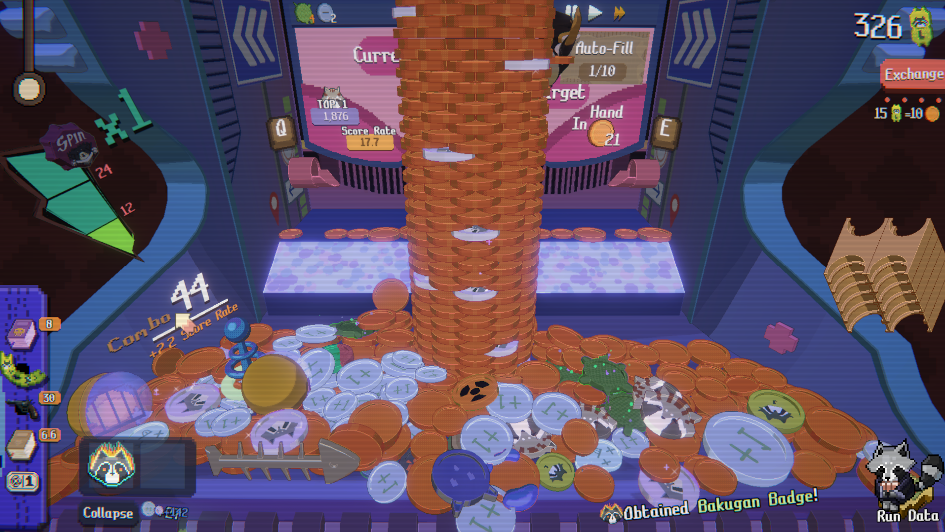 Raccoin, like the very obvious influences on it, actively rewards players for “breaking” the game. It follows the basic premise of meeting a score threshold, but for many, that threshold is only secondary to the main objective, “make the number go up.” That is precisely where Raccoin thrives. There are near-limitless combos, builds, and even different “character” players select that seem to have unique ways to break the game.