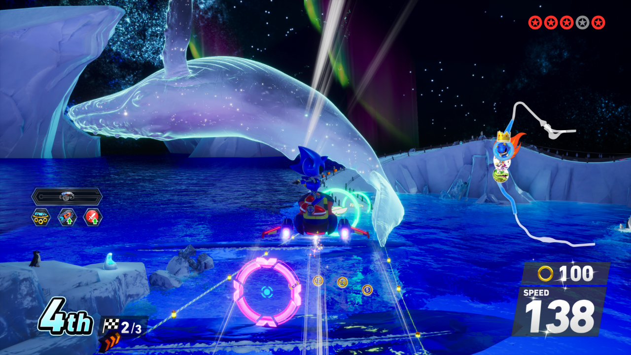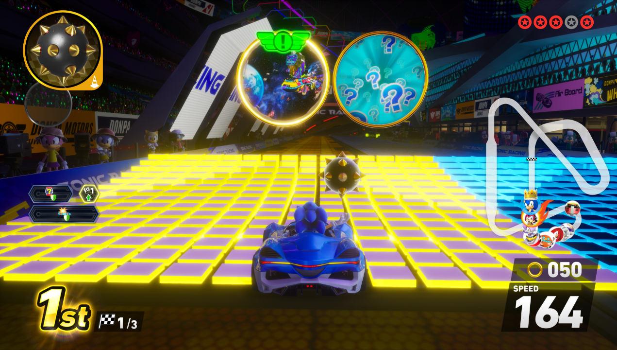 On the surface, Sonic Racing: CrossWorlds looks and plays exactly as you would expect if you’ve played any other kart racers. Racers participate in three-lap races as their favorite characters set on tracks based in the Sonic the Hedgehog game universe, using power-up items to attack and slow down the competition and attain victory. Drifting around corners is also critical to charge up a drift gauge that will provide you with a boost of a varying three levels, and the same goes for performing mid-air tricks. Vehicle transformation gates from Sonic and All Stars Racing Transformed have returned this time, enabling your ride to drive across water in boat-form or soar through the skies like a plane for segments of the track.