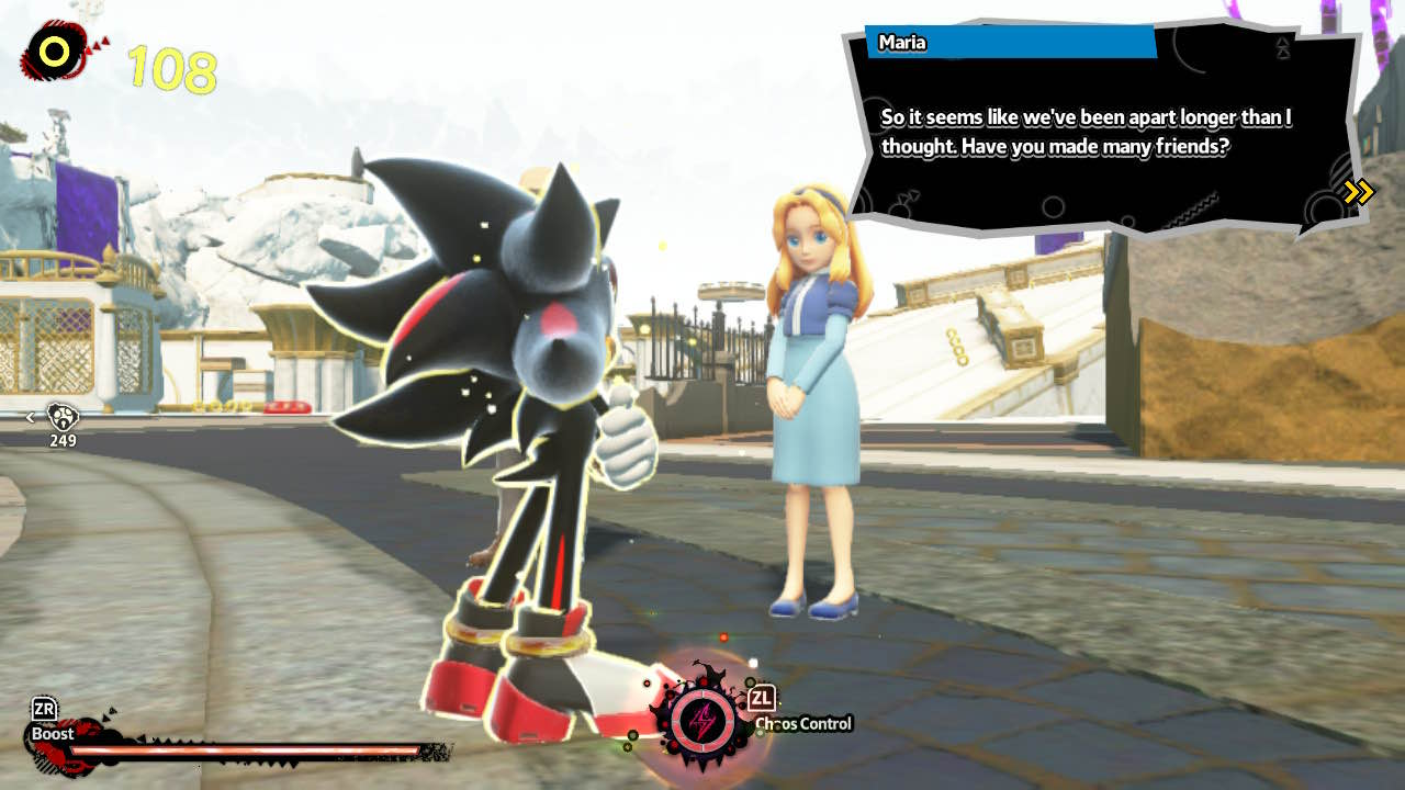 On the other, it is really easy to miss a button and not make the right jump, losing a life. Thankfully, there are plenty of checkpoints throughout the main levels so you don’t have to restart completely each time you make a mistake. There were also some vibrant and lively environments shown in each level, from the Space Colony ARK to a sprawling, industrial landscape to a peaceful valley. However, the downside is that it is hard to marvel at these unique environments with the fast-paced nature of the game. Finally, certain cutscenes bring the action to a screeching halt, but thankfully they do come with a skip button. Though both games have the same rollercoaster pacing, the player is able to do more as Shadow, most notably using Chaos Control to stop time. For example, he is able to stop projectiles mid-air and even use them as platforms.