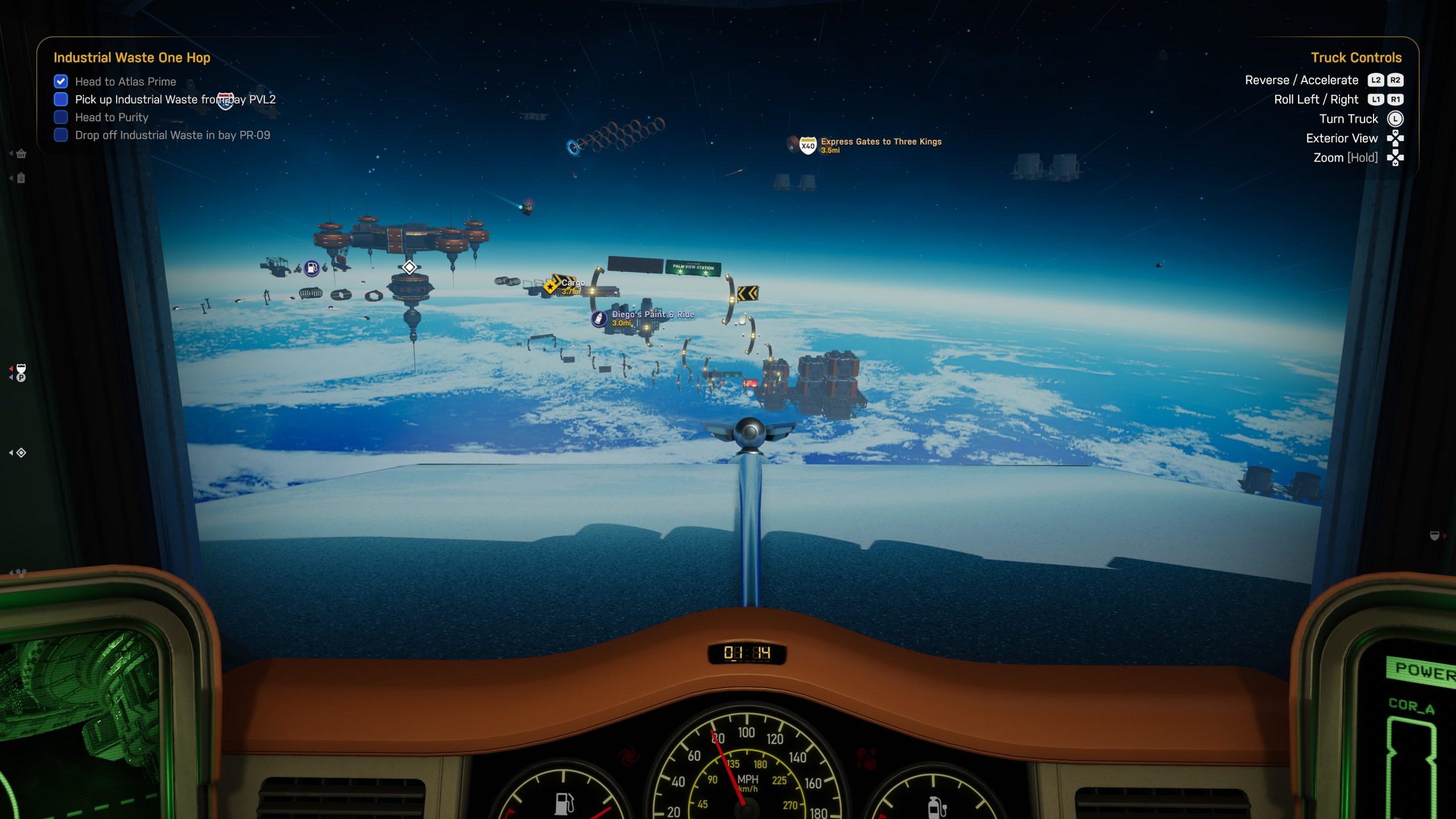 The floaty movement often combined with my next big grievance, the camera. The infinite depth of space meant it was difficult to judge distance from objects such as road signs and other vehicles, and the camera only made this worse. Exterior views don’t zoom out enough to allow angles to judge surroundings better and, when driving in first person, the view is further obfuscated by the truck itself. Switching between the camera views was essential to properly being able to assess surroundings, manage your truck systems and avoid collisions – something which at first, I was awful at.