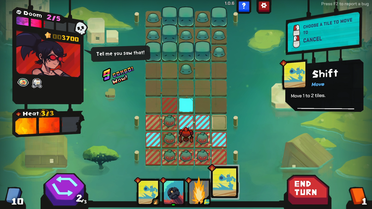 Starvaders has the standard hallmarks of any card building game. Players will collect different cards each with their own passive and offensive abilities that can help you turn the tide in battle. You start out each turn with a selection of cards to use in the fight and have to strategically use the right cards in order to beat all invaders. It sounds relatively easy, however, there are a few things that you have to keep track of throughout your turn. The first is that each time a card is placed you use something called Heat. You get a limited amount of Heat per turn and going past this amount will mean the card you play will be unusable for the rest of the level. In addition to that you can also obtain blank junk cards if you get caught in the crossfire of an enemy’s — or even your own — attack. Finally, there is Doom. When an enemy gets to the last 3 rows of the grid they build up Doom and must be eliminated within your next go. If you obtain 5 Doom at any point during your run it’s an instant game over.